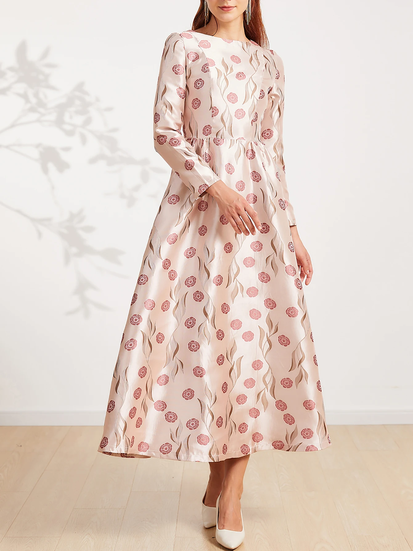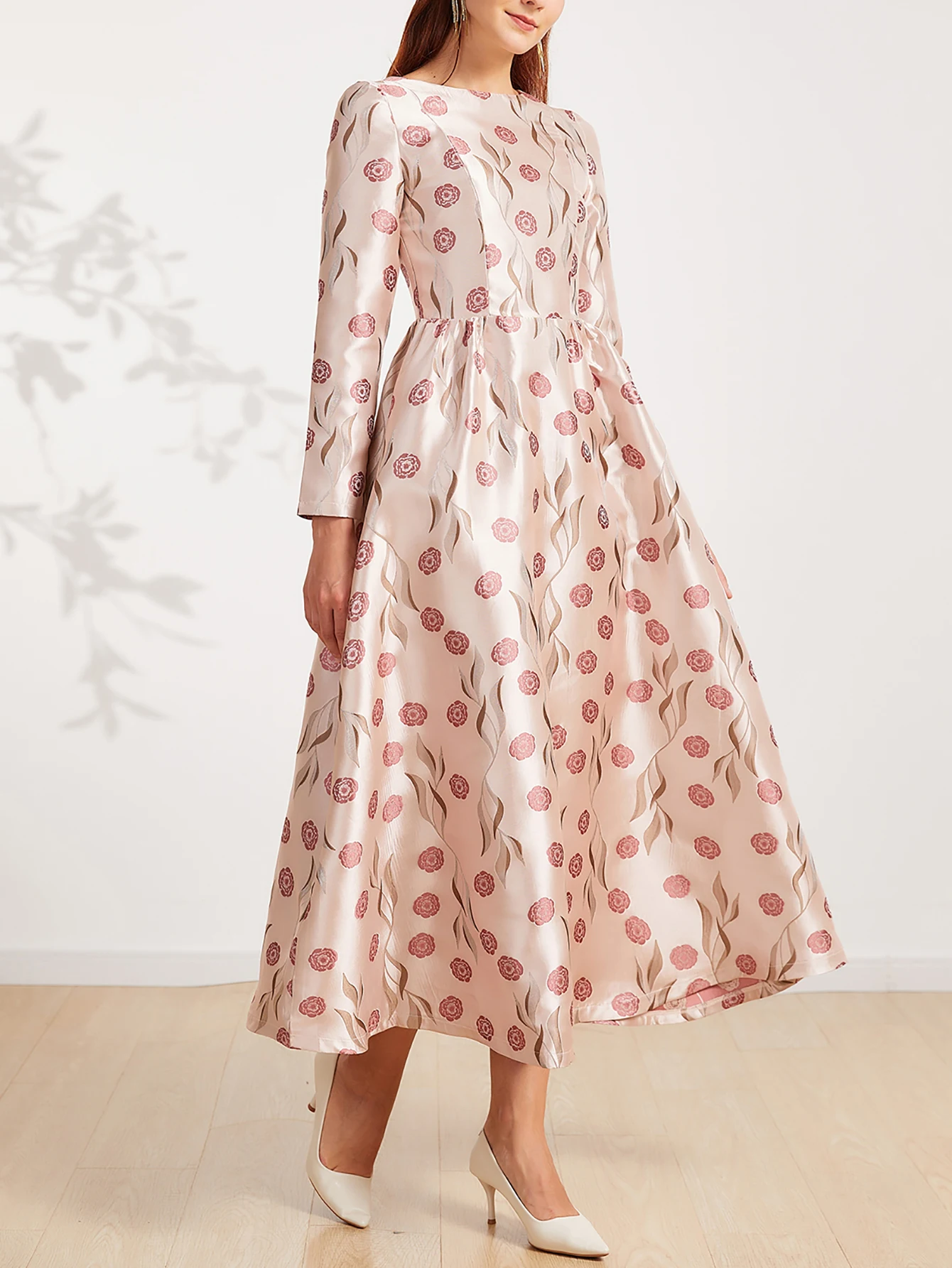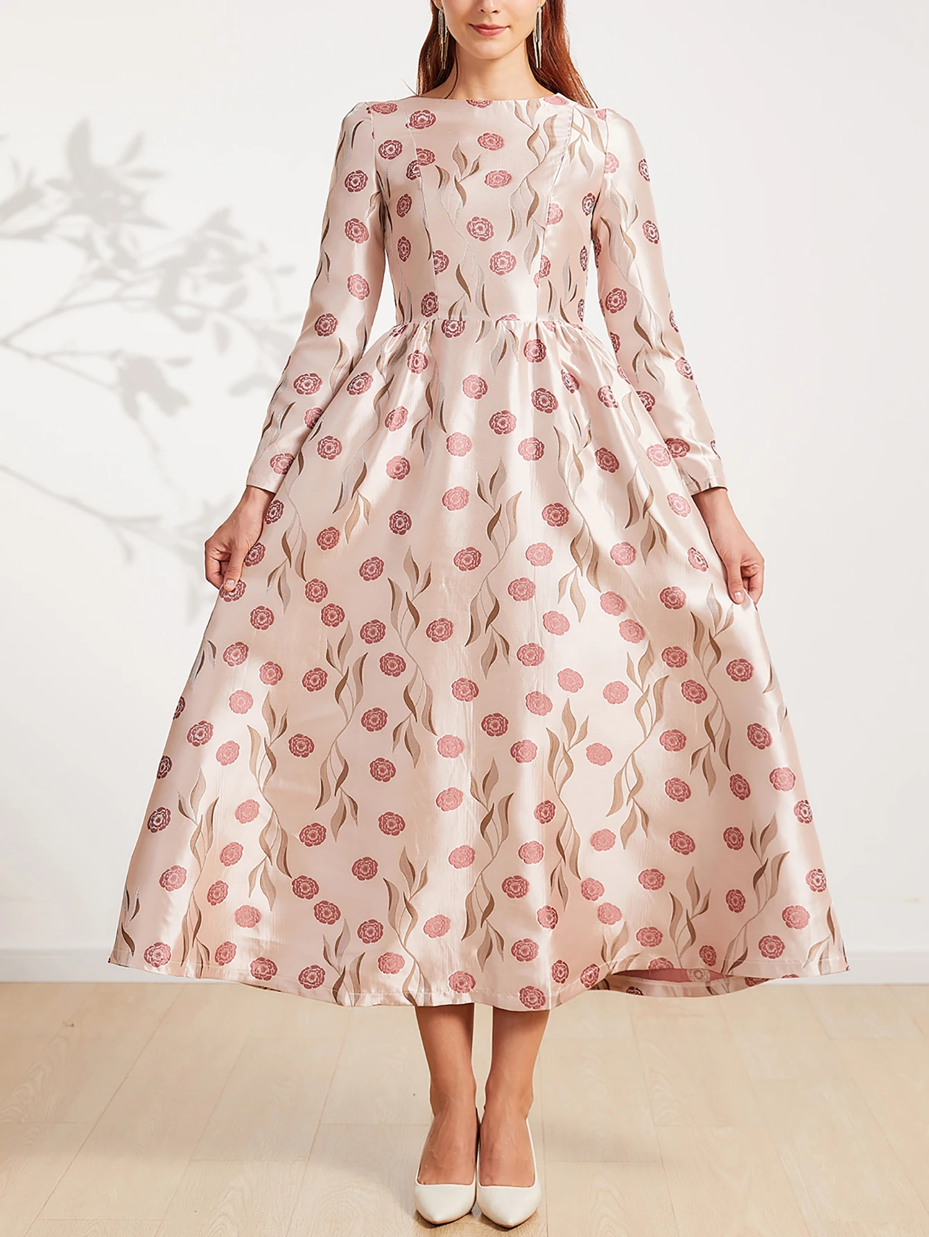 Women Autumn Dress Retro Boho Jacquard Long Sleeve Gorgeous Floral Party Dress