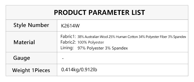 Hign-concerned Chemical:None Release Date:Autumn 2024 Craft of Weaving:Tat Season:Autumn/Winter Age:Middle Age Place Of Origin:China (mainland) Model Number:K2614W Pant Style:STRAIGHT Front Style:Flat Waist Type:MID Pattern Type:Solid Decoration:Embroidered Flares Closure Type:Zipper Fly Fabric Type:Blended Fit Type:Regular Style:Formal Length:full length Material:Cotton,POLYESTER,Wool,Spandex Gender:Women Origin:Mainland China Brand Name:Serathinan CN:Guangdong Elasticity:Slight Strech