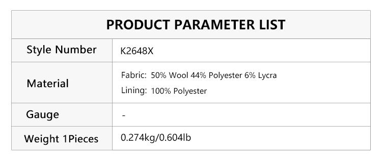 Hign-concerned Chemical:None Release Date:Autumn 2024 Craft of Weaving:Tat Season:Autumn/Winter Age:Middle Age Place Of Origin:China (mainland) Model Number:K2648X Pant Style:pencil pants Front Style:Flat Waist Type:MID Pattern Type:Solid Decoration:Embroidered Flares Closure Type:Zipper Fly Fabric Type:Woolen Fit Type:Regular Style:Formal Length:full length Material:POLYESTER,LYCRA,Wool Gender:Women Origin:Mainland China Brand Name:Serathinan Elasticity:Slight Strech CN:Guangdong