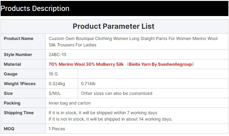 Hign-concerned Chemical:None Craft of Weaving:Tat Season:Spring/Summer Age:Middle Age Model Number:BC1022 Pant Style:STRAIGHT Waist Type:MID Pattern Type:Solid Decoration:Beading Fabric Type:Knitted Fit Type:Regular Style:Casual Length:Ankle-Length Pants Material:Silk,Wool Gender:Women Origin:Mainland China Brand Name:Serathinan CN:Guangdong Elasticity:Medium Strecth