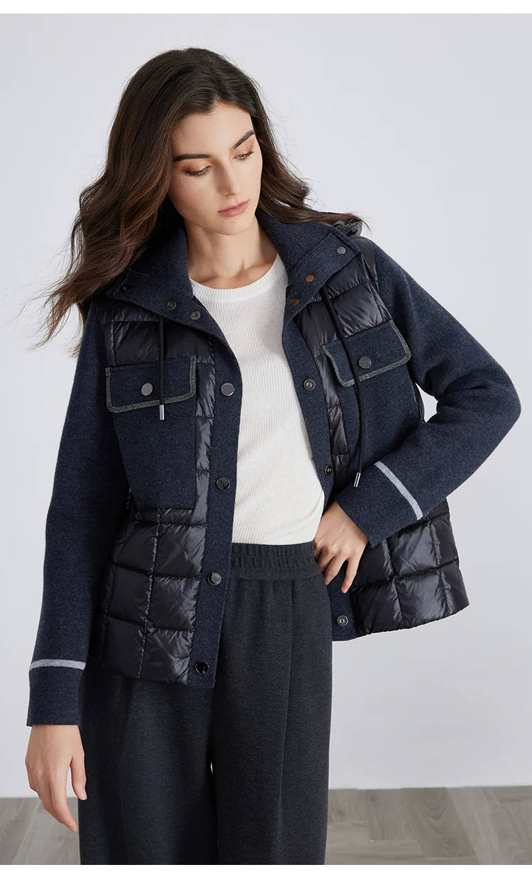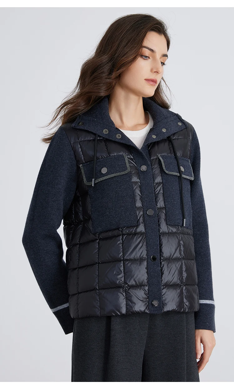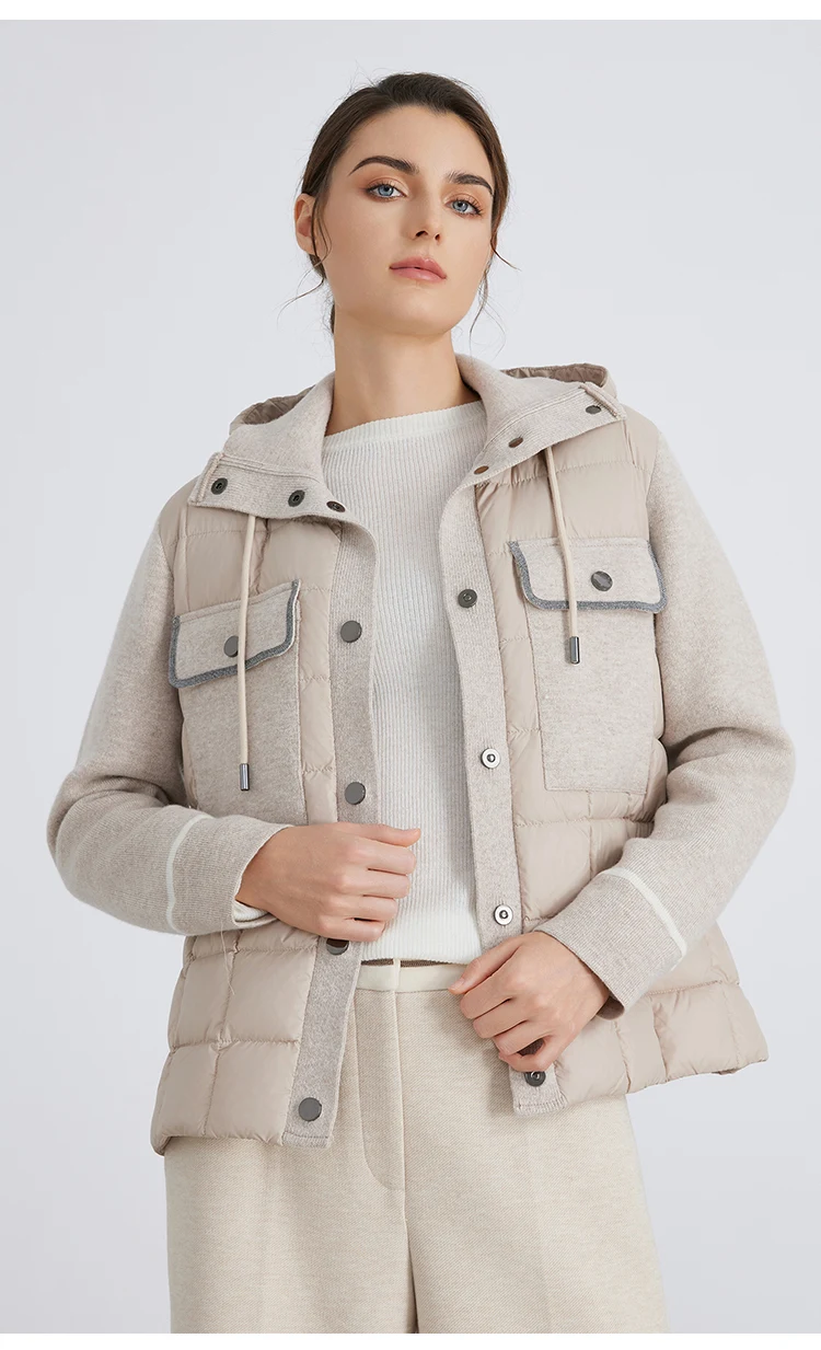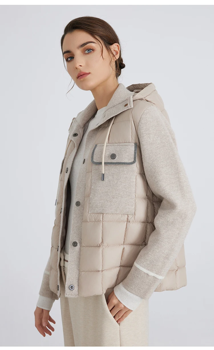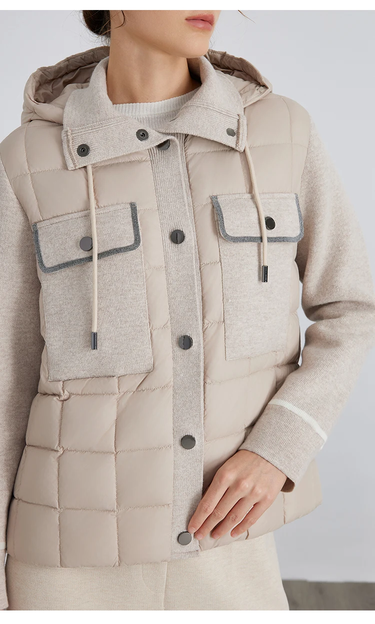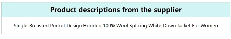 pocket design hooded 100% wool splicing white down jacket for women