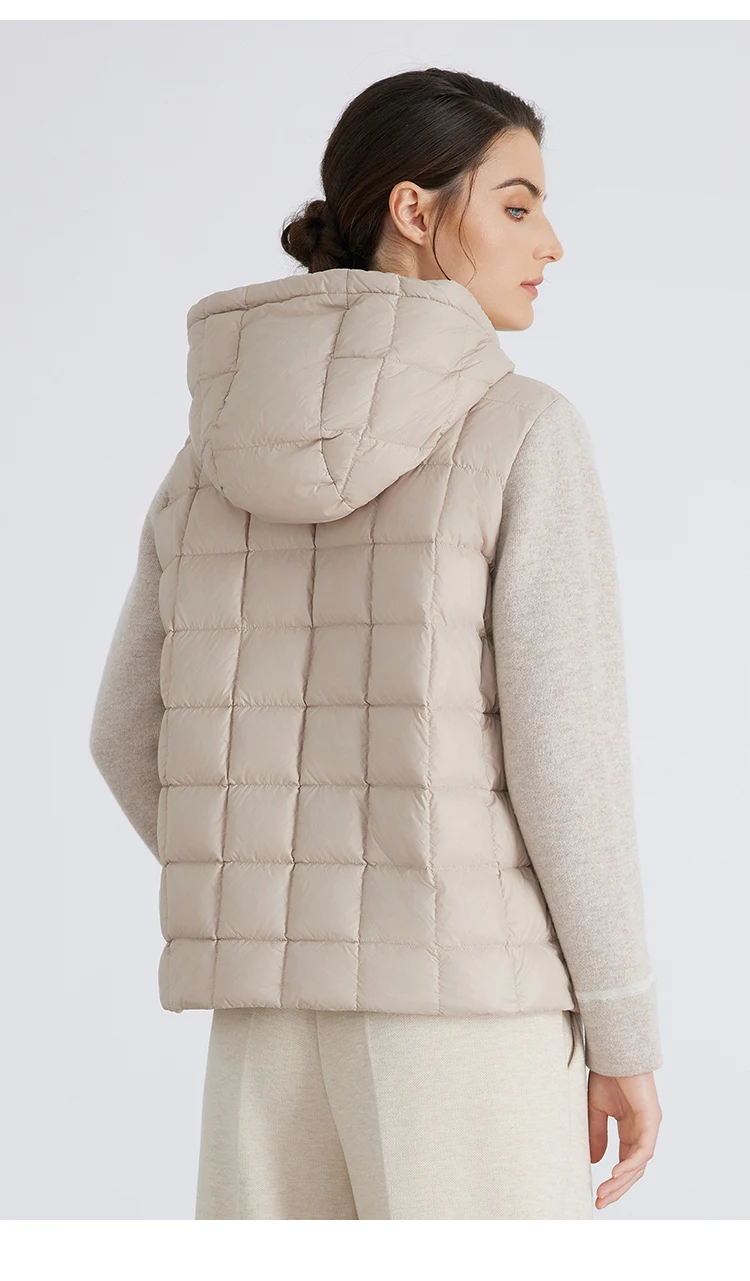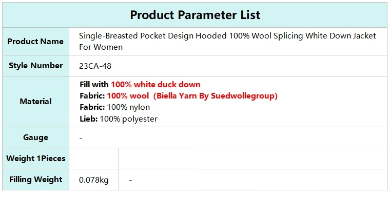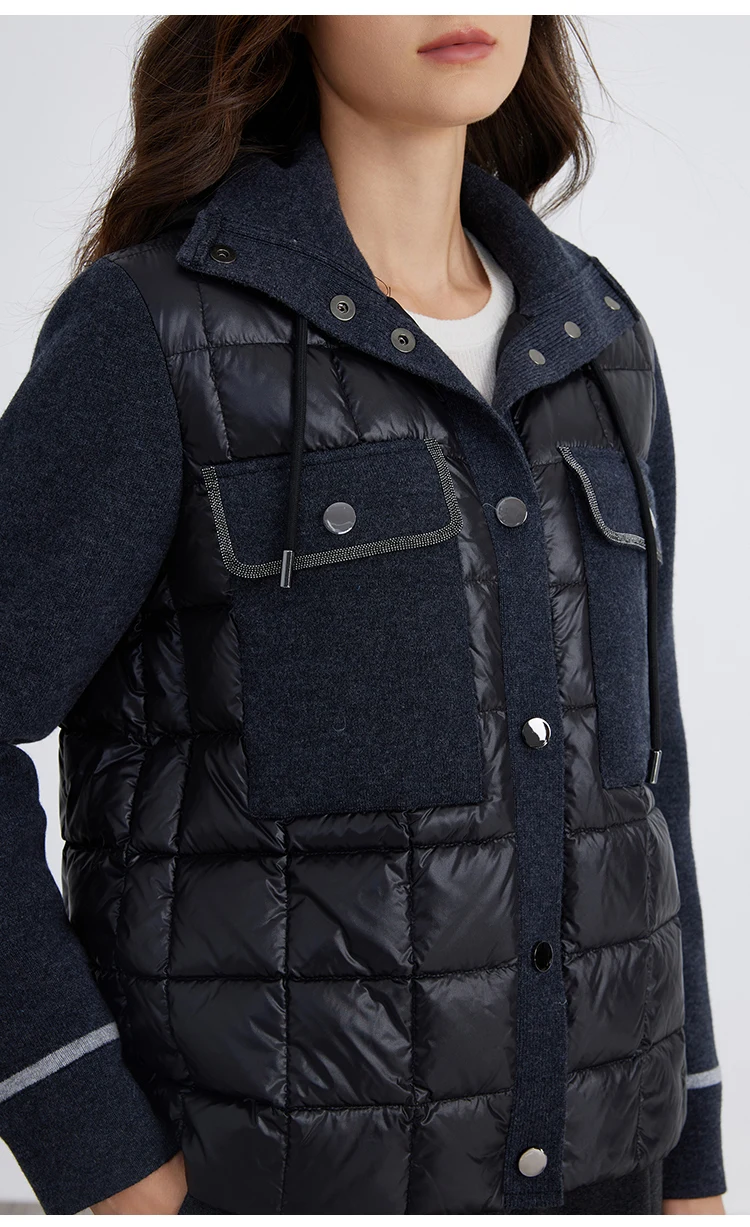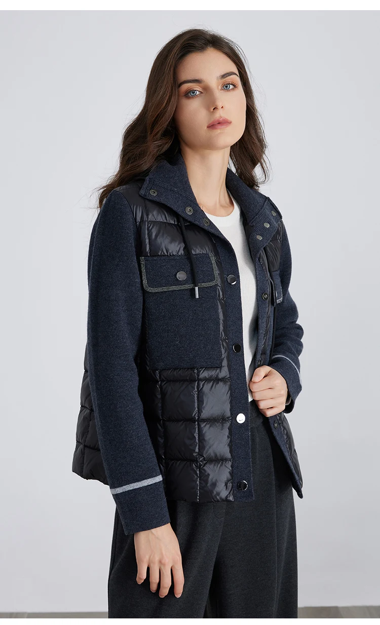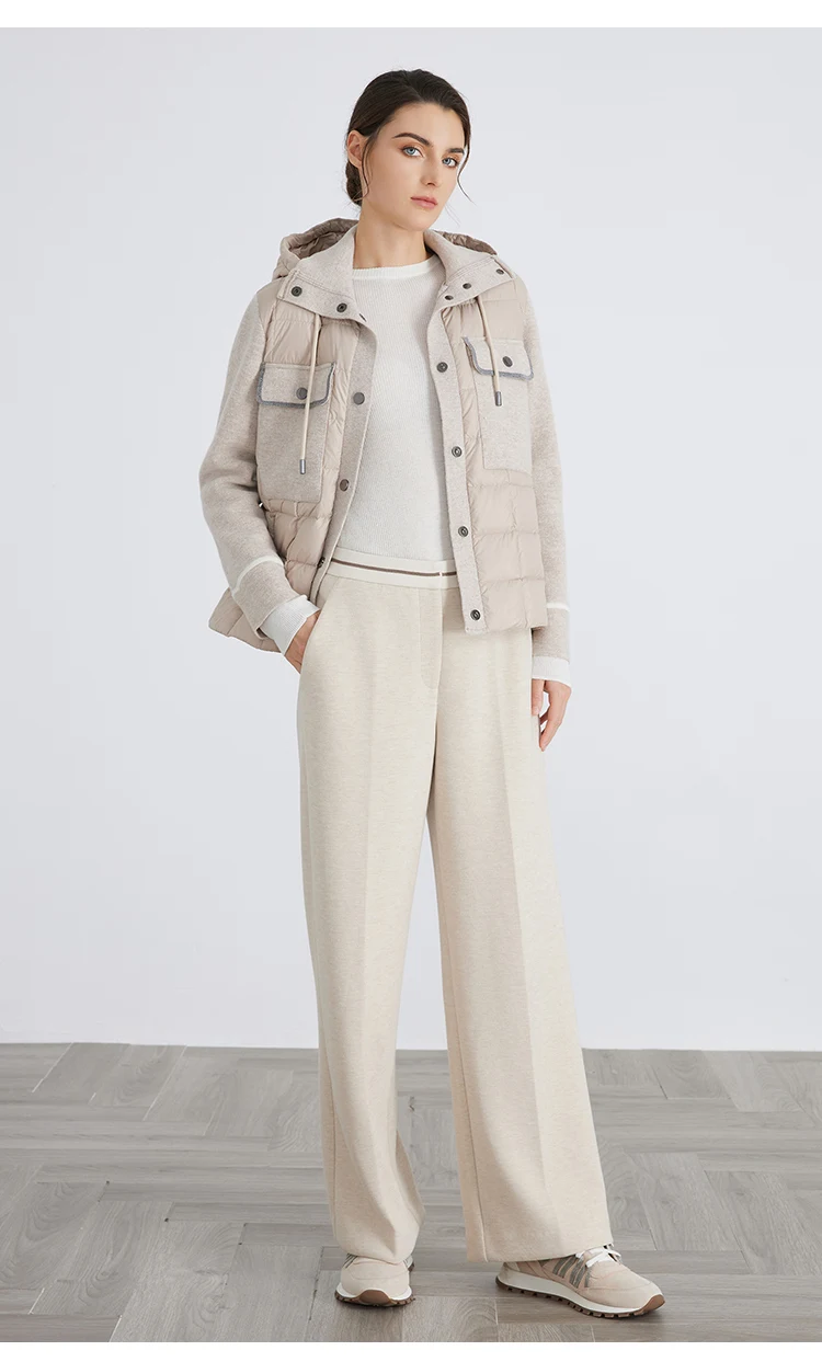 pocket design hooded 100% wool splicing white down jacket for women