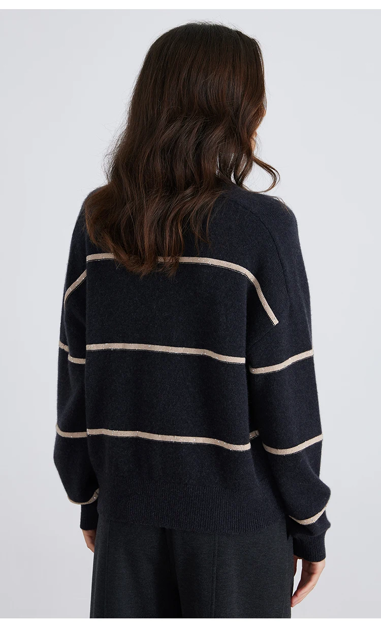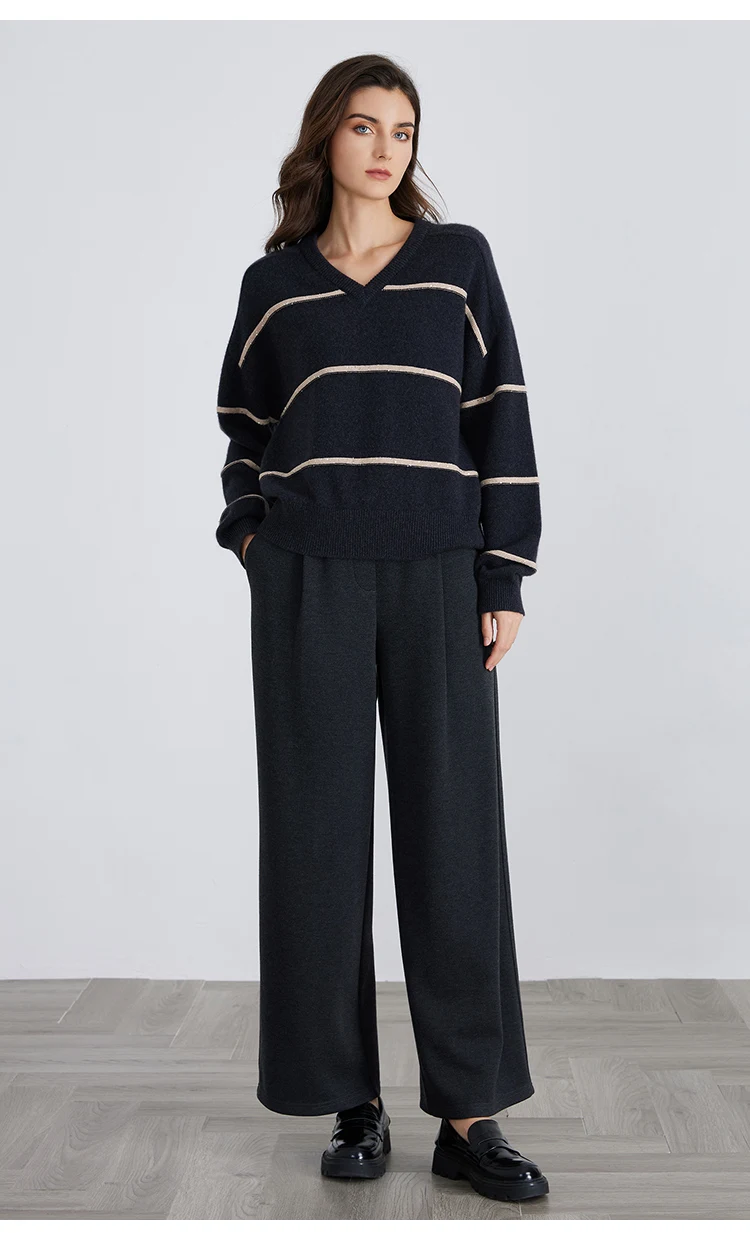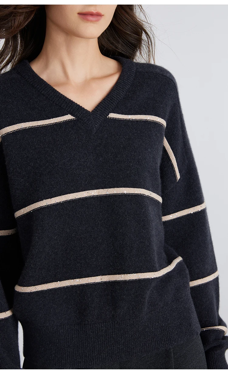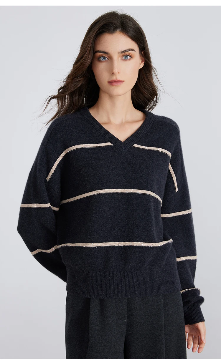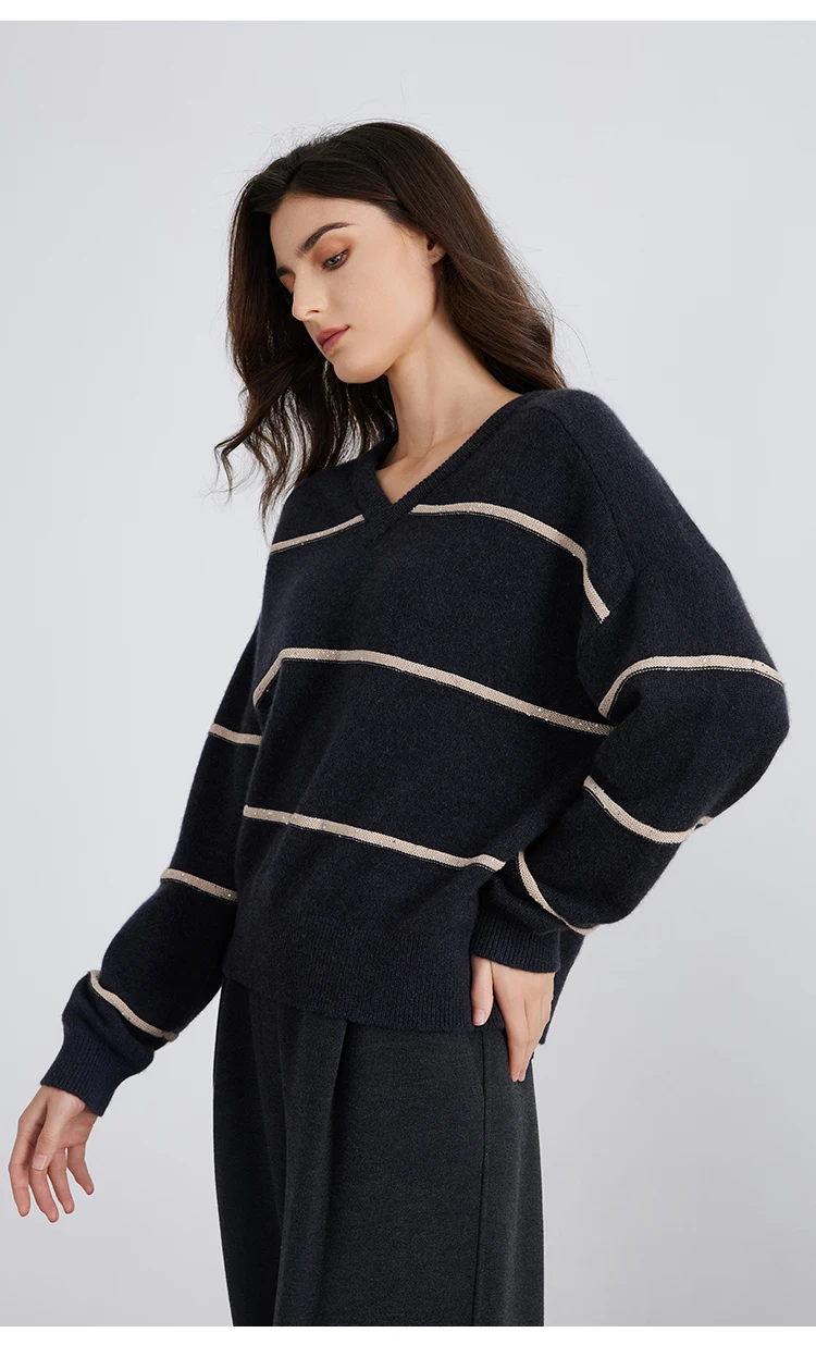 whether full opening:No Hign-concerned Chemical:None Release Date:Winter 2024 Craft of Weaving:Knit Pattern:Loose-fitting Yarn Thickness:Regular yarn Percentage of Material:95% above Season:Winter Age:25-34 Model Number:BC821 Place Of Origin:China (mainland) Closure Type:Pullover Pattern Type:Striped Gender:Women Sleeve Length(cm):Full Style:Casual Decoration:Beading Material:Cashmere Sleeve Style:Regular Collar:V-Neck Clothing Length:Regular Material Composition:100% Cashmere Brand Name:Serathinan Closure Type:Pullover Elasticity:Slight Strech Fit Type:Loose Origin:Mainland China CN:Guangdong